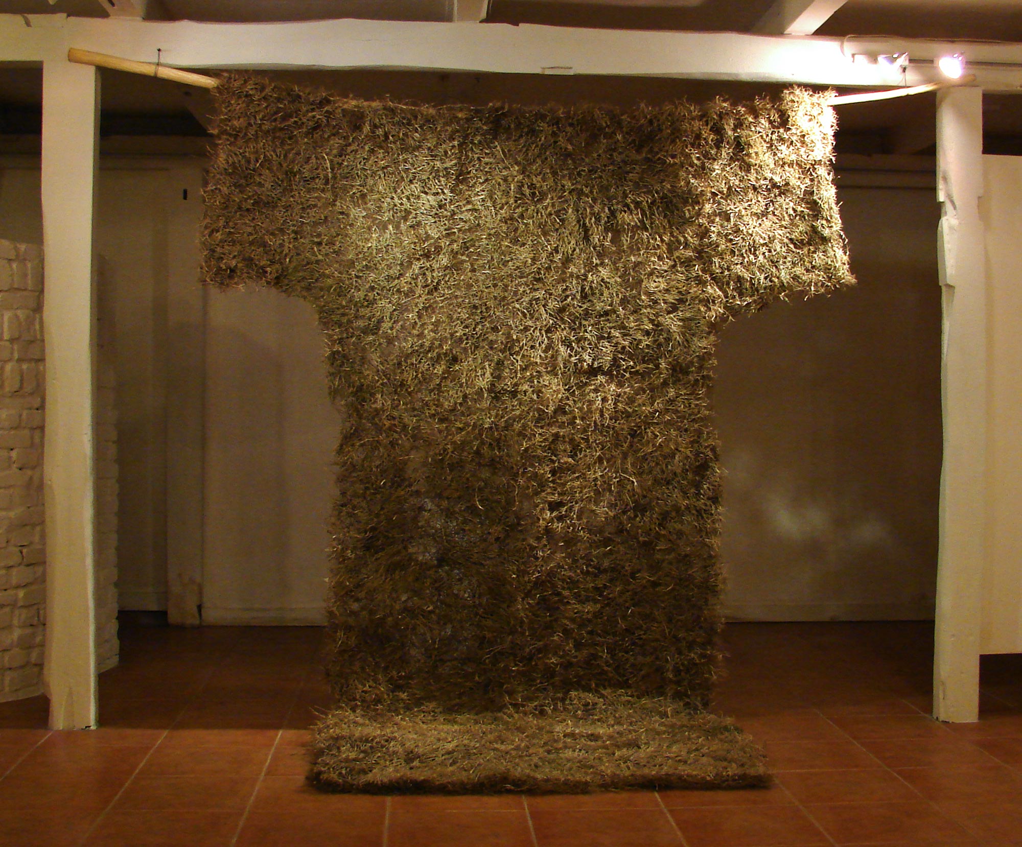 Un manteau d’herbe réalisé au cours de la résidence à Wongol, et exposé à la galerie Ko en fin de résidence, en même temps que la vidéo « Walk & sit ». Le dégagement des chemins de l’installation a permis de récupérer et assembler les couches superficielles d’herbe pour en faire cette tunique, « le manteau de la terre ».